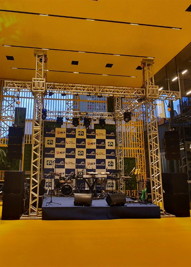 A locação inclui a definição da estrutura ideal de som, fornecimento dos equipamentos, montagem, operação técnica durante o evento e desmontagem. Todo o sistema é dimensionado de acordo com o público, o ambiente e o tipo de evento.